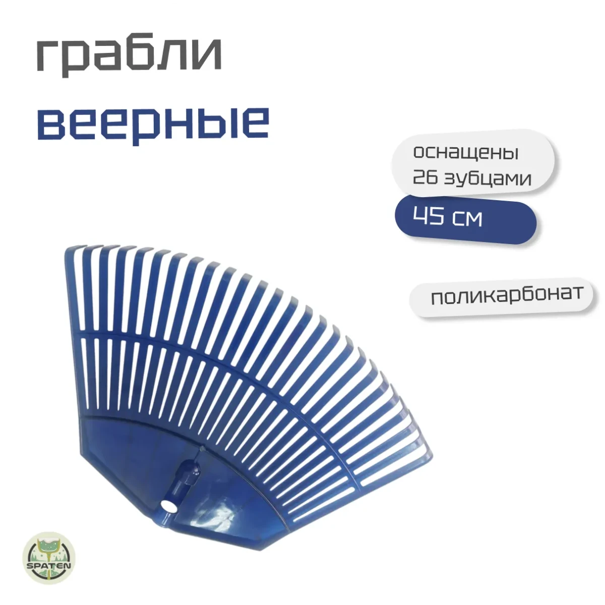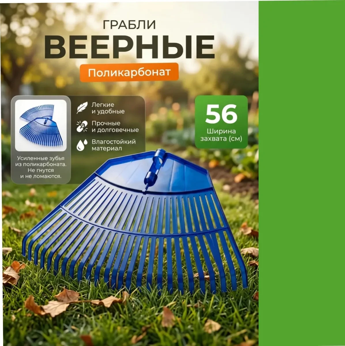 Веерные грабли с 26 зубьями изготовлены из переработанного поликарбоната. Они бережно ухаживают за газонами, клумбами и дорожками у дома. Основное преимущество — эффективный сбор листвы, травы и мелких отходов без повреждения корней растений. Грабли подходят для работы на неровных поверхностях благодаря упругости зубьев.